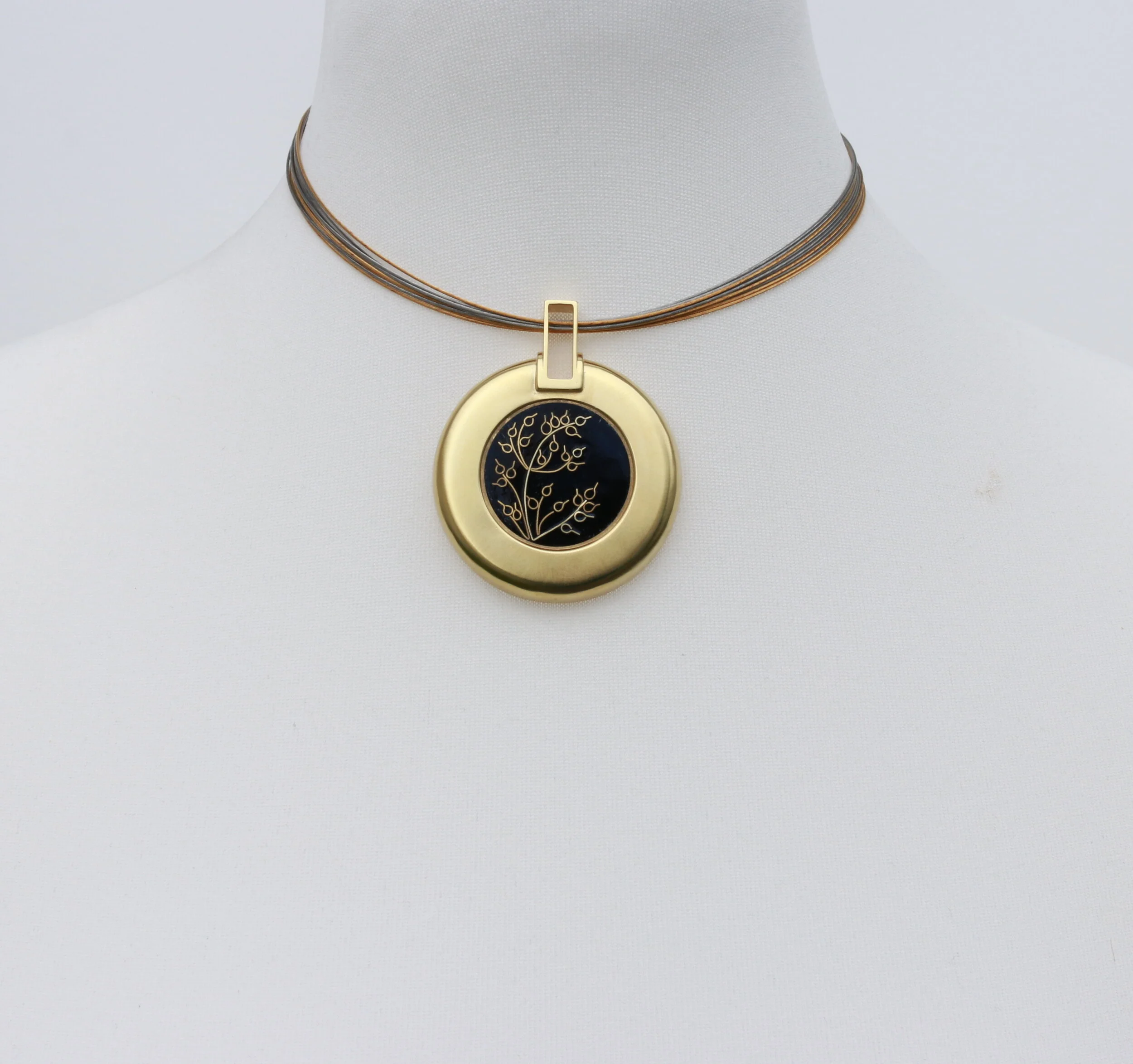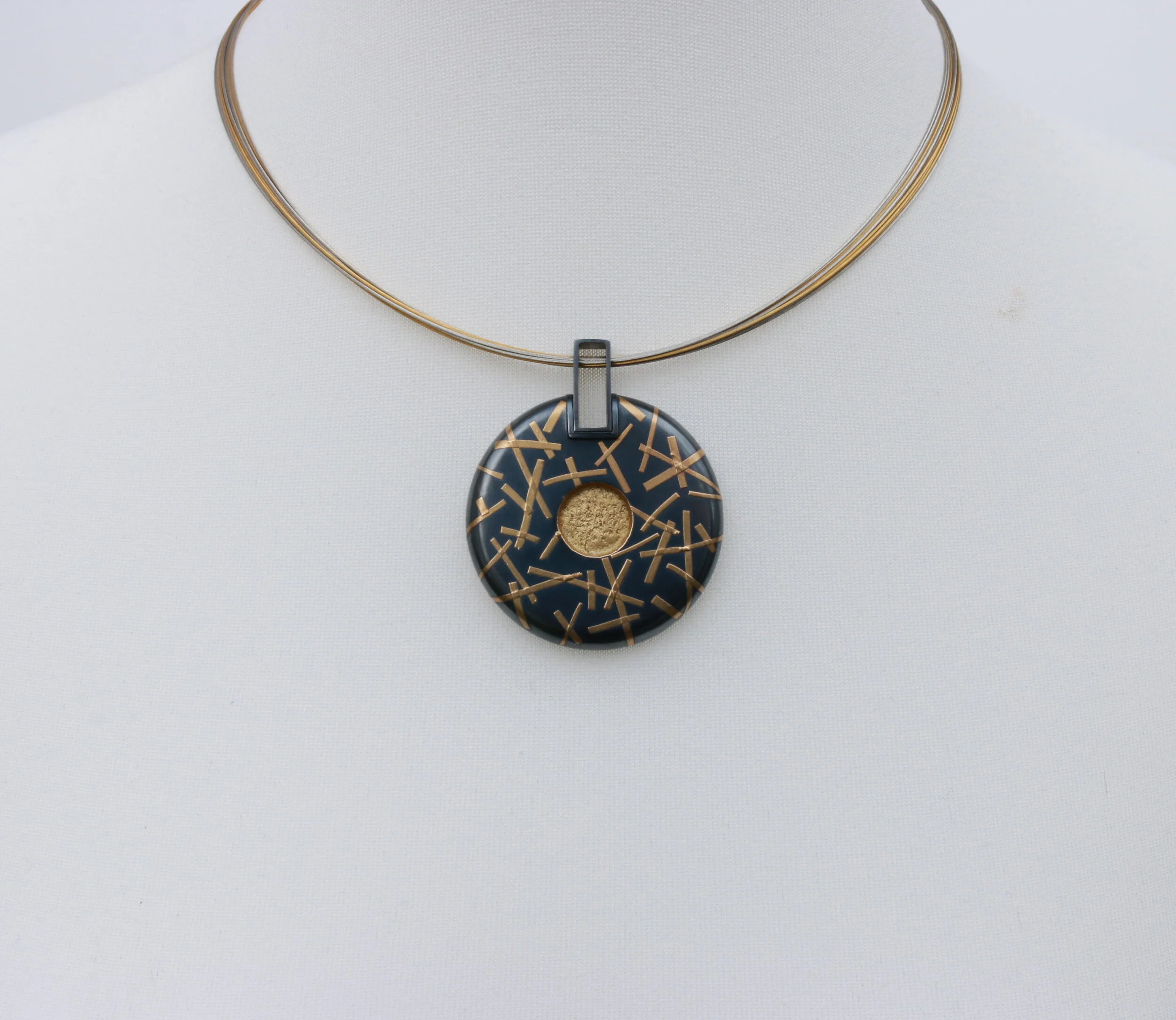18k gold plated sterling silver pendant with 18k gold cloinssoné wire in black enamel